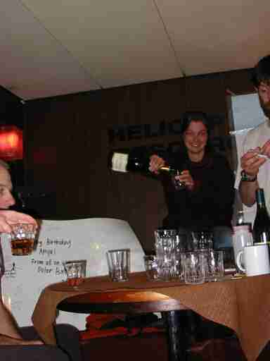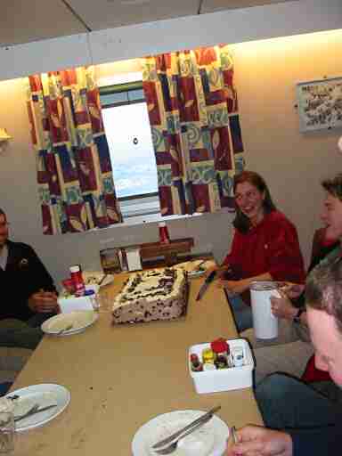 A special day for us, being Anya's Birthday. The weather was perfect, sunny and calm. We could have been crossing the Tasman Sea at a glimpse. The reality was though, the air and sea temperatures were hovering around 2 degrees ! At last we were picking up some speed, up to a mighty 9.5 knots !! To kill time, Joe, Adam and co were playing golf from B deck down to the bar which was causing a bit of mirth. At 4.30 We had a meteorology training session down in the bar which quickly transcended into a birthday party for Anya. Cracking of champagne, Pinot Noir's and the presentation of an autographed, laminated satellite image of the Southern Mawson Escarpment. Anya and I discovered that we both knew a remarkable Polish lass, Danushka from older times. I met her on the 3 day barge trip from Puerto Williams to Punta Arenas earlier in the year, and Danushka had earlier assisted Anya with the BAS work. A small world indeed ! The birthday cake was a spectacular half ton chocolate extravaganza of Janine's. The party extended well until the small hours. Good stuff. No bergs but.