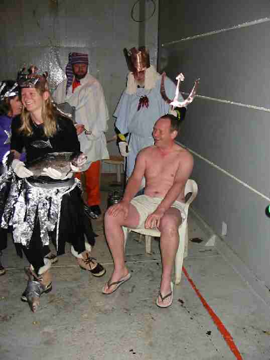 Neptune's Day. An eventful day for all sorts of reasons. The first real iceberg was spotted, looming out of the early morning fog. A real pearler, 350m long and 50m high (the 1/9th of what is supposed to be visible), we passed it by at a safe range of 8 km as the fog started to lift. Gary the birdman won the berg sweep, deservedly so ! The remainder of the day was sunny, but deceptively cold, the mercury exactly at zero in and out of the water, with a biting 20 knot WNW wind. Giant petrels glided around the stern and at about 1.30 p.m. we crossed the legendary 60° latitude South. Another smaller and smoother berg passed by at a range of less than 2km. All of us non-Antarcticans were summoned to the mess at 4.45 for some meeting. What we thought would be something like a citizenship ceremony turned out to be somewhat different. King Neptune (the viking chief engineer) in all his mop and foil finery accompanied by his ice queens Aphrodite (our veteran lady expeditioners) proclaimed our citizenship of the Great Southern Ocean and without further ado we were summoned in groups down below the sea into Hold number three for the ritualistic initiation which involved tabasco sauce, fish and the ordeal of ordure. It was good fun for most ! The laundry is booked for the next week. A whale was spotted, spouting to port. The evening was spent watching "The Sixth Sense" with Bruce Willis, a suprisingly good flick.