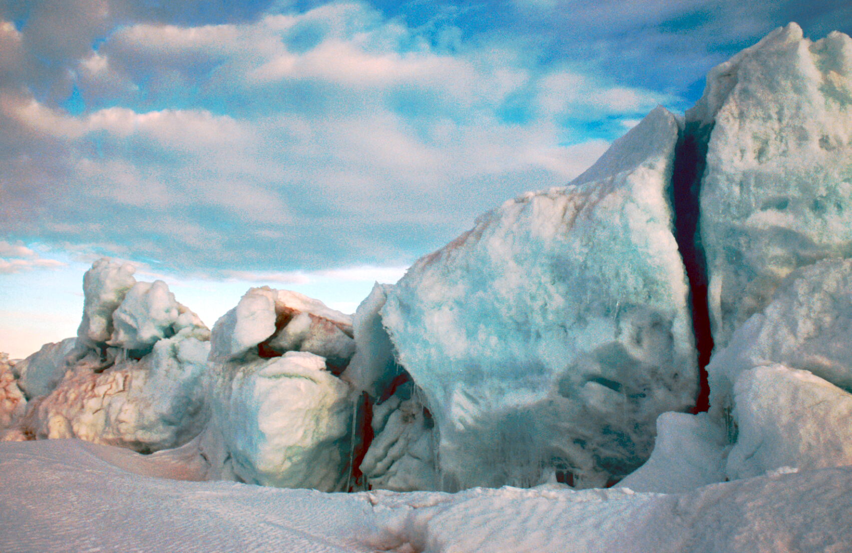 Midnight sun over Pagodroma Gorge and pressure ridges