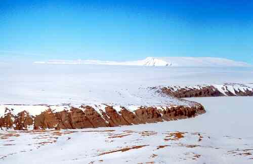 Approaching Beaver lake camp, snow covered Prince Charles Mountains in the background