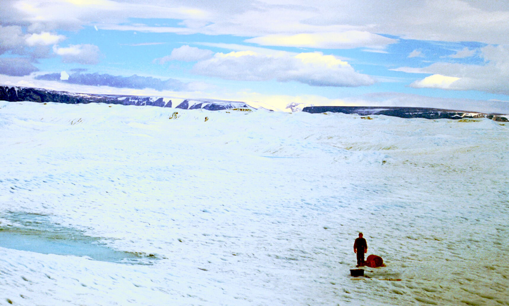 Tom waiting at TS5 on the Lambert Glacier, Mawson Escarpment in the background