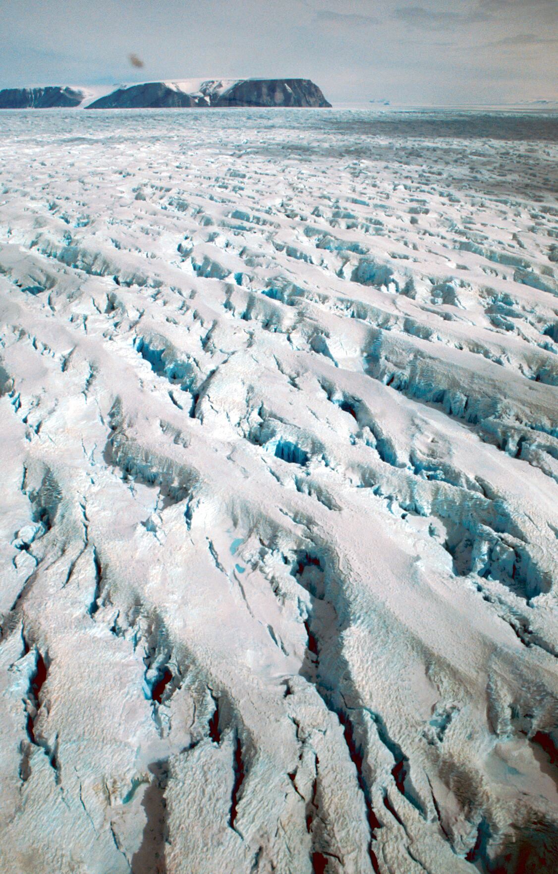 Major crevassing at the junction of the Lambert and Mellor Glaciers with Cumpston Massif in the background