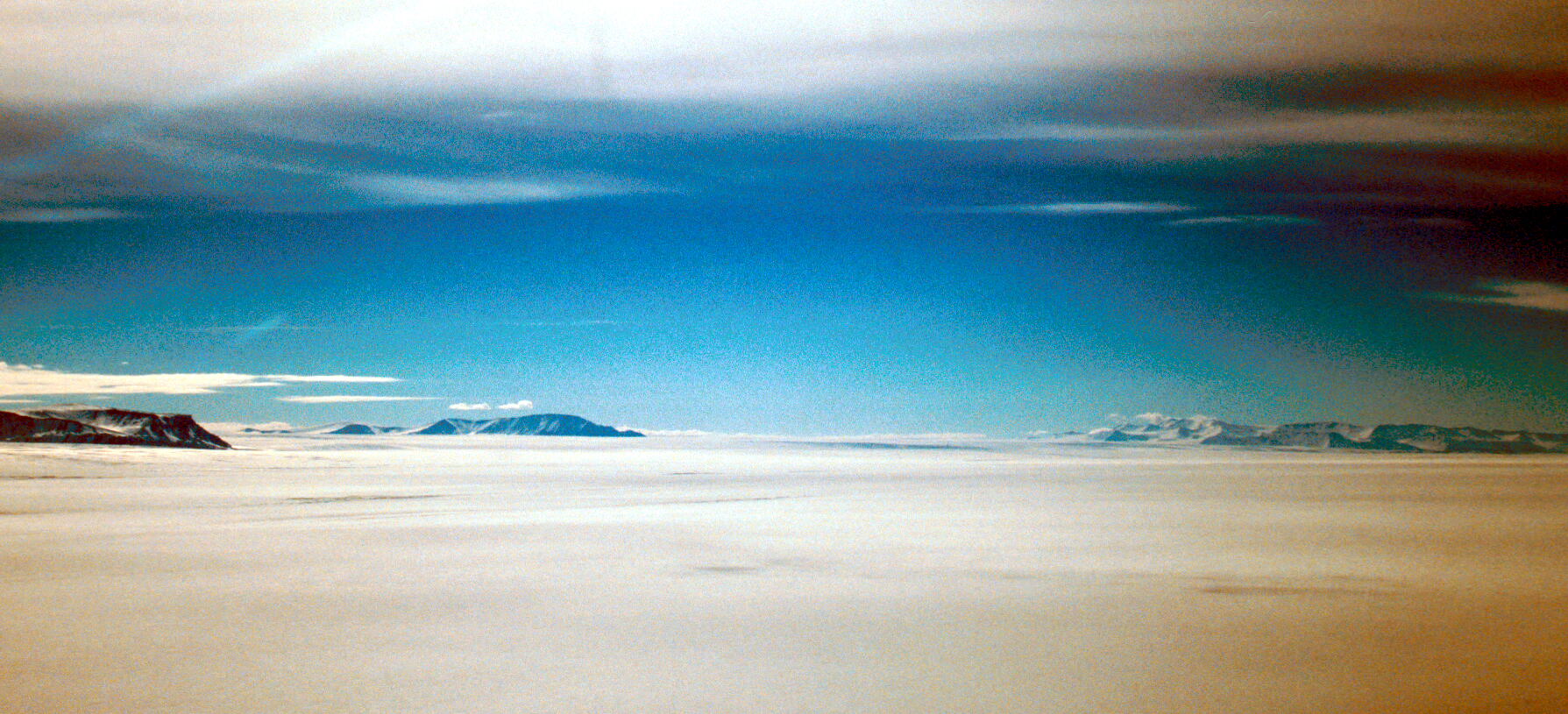 Surface of the Lambert Glacier, looking south-west along the Mellor Glacier between the Cumpston massif (left) and Mt. Rubin (right)