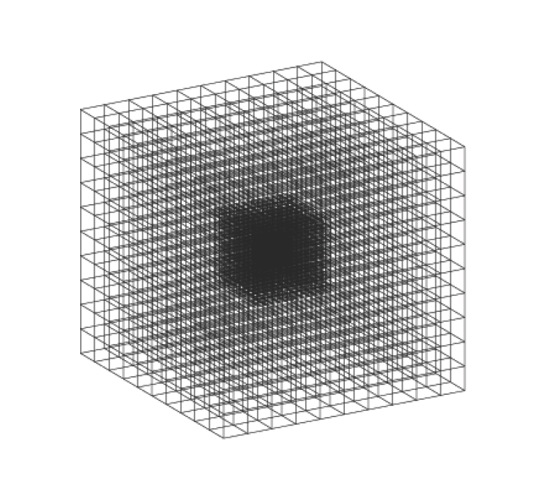 An illustration of a nested grid in three dimensions. The program pgs mpi visits each point in the lattice and finds either the maximum or minimum of a user supplied function. The workload is distributed approximately evenly among an arbitrary number of cores in a cluster. |
